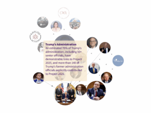 Roughly 70% of Trump’s cabinet and 50+ senior officials have direct ties to Project 2025. Over 140 former Trump appointees and several current senior cabinet officials contributed to writing the plan, including Russell Vought, Stephen Miller, and more.